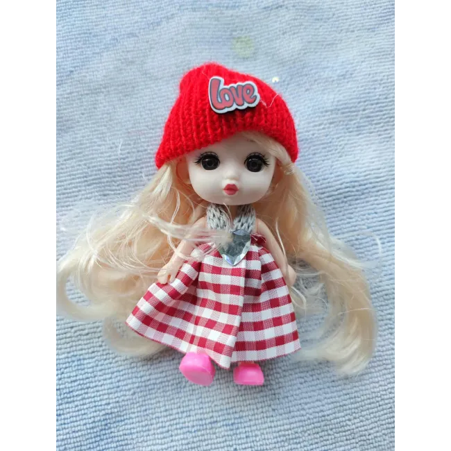Laleczka ma długie blond włosy, czapkę z napisem LOVE w intensywnie czerwonym kolorze i sukienkę w kratkę ozdobioną błyszczącym serduszkiem.