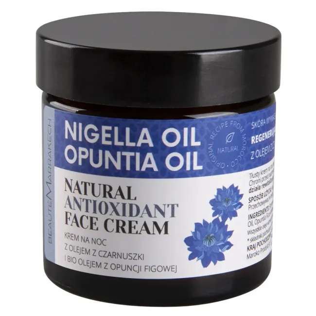 Regenerujący krem na noc do twarzy i pod oczy z bio olejem z opuncji figowej i olejem z czarnuszki od Beaute Marrakech to intensywna pielęgnacja skóry wymagającej odnowy. Formuła oparta w 100% na składnikach pochodzenia naturalnego, bez dodatku wody, zawiera bogatą kompozycję nierafinowanych olejów roślinnych. Krem wspiera regenerację skóry, poprawia jej elastyczność i pomaga zmniejszyć widoczność zmarszczek oraz przebarwień. Doskonale sprawdzi się w pielęgnacji cery suchej, dojrzałej, wrażliwej oraz skóry z pierwszymi oznakami starzenia. Delikatna konsystencja pod wpływem ciepła dłoni zamienia się w odżywcze, lekkie masło, które łatwo się wchłania i pozostawia skórę miękką oraz wygładzoną.