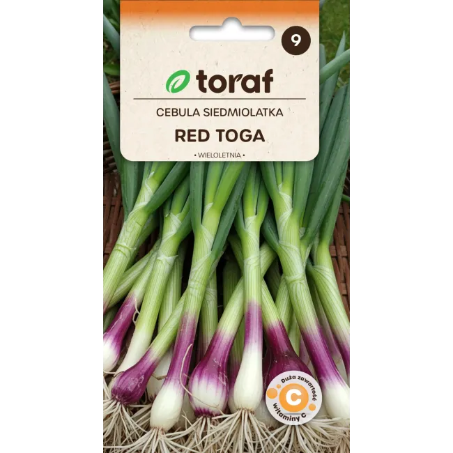 Cebula siedmiolatka Red Toga to wieloletnia, mrozoodporna odmiana wyróżniająca się dekoracyjnym wyglądem i wysokimi walorami użytkowymi. Tworzy atrakcyjne, purpurowo-czerwone zgrubienia, które stopniowo przechodzą w zielone, rurkowate liście. Roślina silnie się rozrasta, tworząc kępki i może rosnąć w jednym miejscu nawet 4–5 lat, zapewniając regularne zbiory aromatycznego szczypioru. Odmiana bogata w witaminy C i A oraz żelazo, idealna do codziennego wykorzystania w kuchni. Nasiona marki Toraf gwarantują wysoką jakość i dobre wschody.