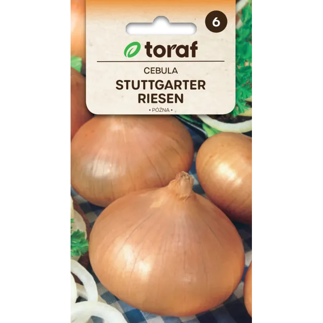 Cebula Stuttgarter Riesen to sprawdzona, późna odmiana o dużych, lekko spłaszczonych cebulach i jasnej, słomkowo-żółtej łusce. Kremowy miąższ charakteryzuje się lekko ostrym, wyrazistym smakiem, cenionym w codziennej kuchni. Odmiana jest bardzo plenna i doskonale nadaje się zarówno do bezpośredniego spożycia, jak i do długiego przechowywania. Najlepiej rośnie na glebach żyznych, dobrze uprawionych. Nasiona marki Toraf zapewniają wysoką jakość i dobre wschody.