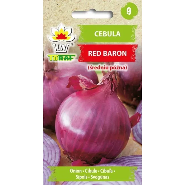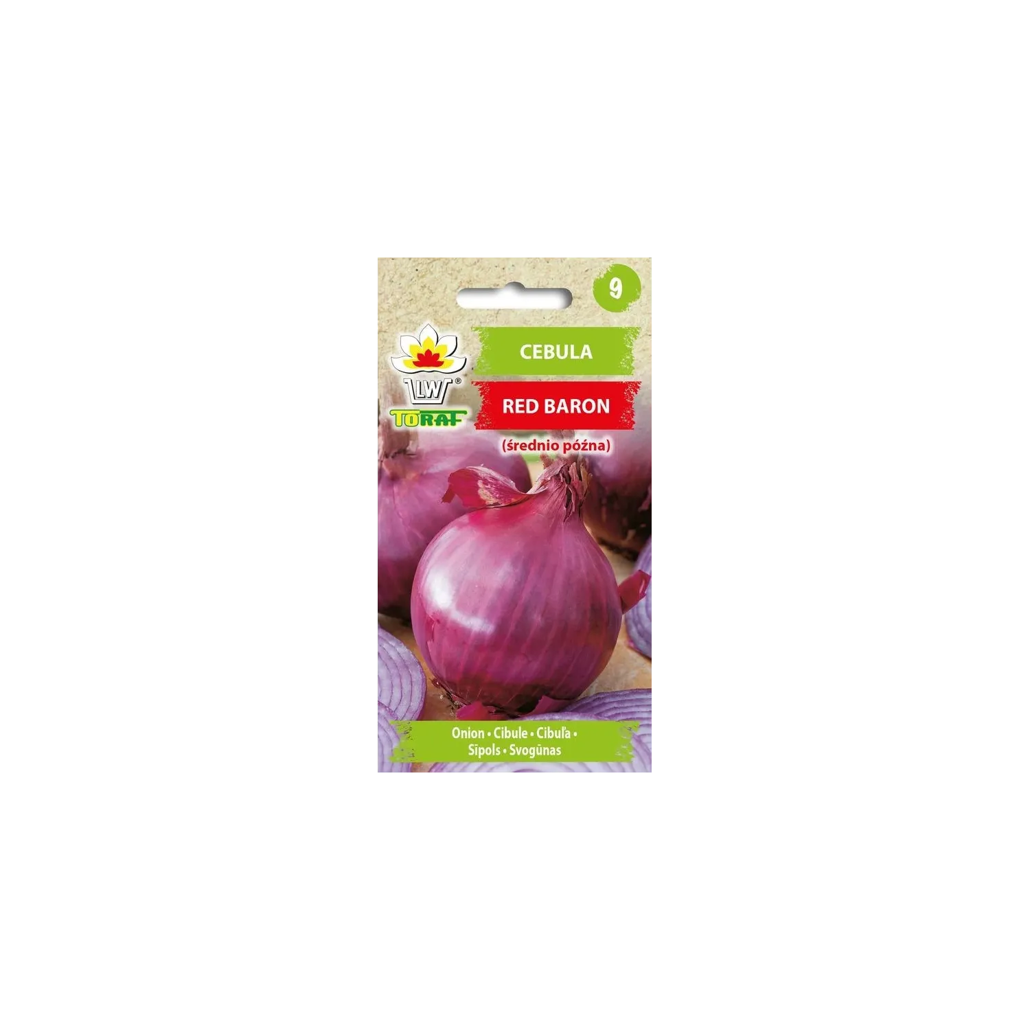 Cebula Red Baron to znana i ceniona, średnio późna odmiana o intensywnej czerwono-fioletowej łusce i doskonałych walorach smakowych. Tworzy kuliste, średniej wielkości zgrubienia, lekko spłaszczone ku górze, o masie od 150 do 200 g. Fioletowo-biały miąższ jest wyjątkowo chrupki, delikatny i łagodnie słodkawy w smaku. Odmiana idealna do spożycia na surowo, szczególnie jako dodatek do sałatek. Nadaje się również do przechowywania, zachowując wysoką jakość po zbiorze. Nasiona renomowanej marki Toraf gwarantują dobrą jakość i wyrównane wschody.