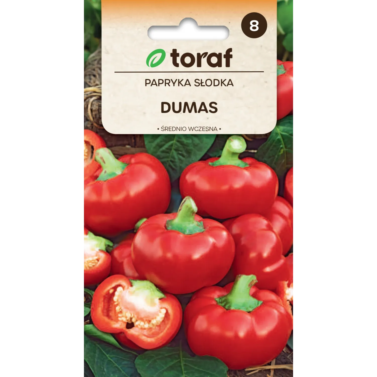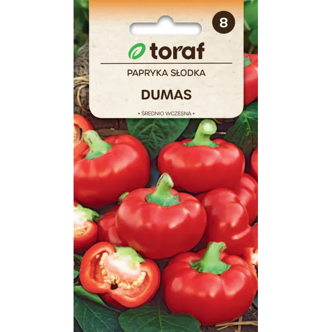 Papryka słodka Dumas to średnio wczesna odmiana o atrakcyjnych, czerwonych, kulistych owocach, których kształt przypomina pomidora. Owoce osiągają wagę około 90 g, mają soczysty, słodki i bardzo smaczny miąższ. Odmiana przeznaczona jest do uprawy w gruncie oraz w niskich tunelach foliowych, a dzięki kompaktowemu pokrojowi doskonale sprawdza się również w uprawie doniczkowej. Idealna do bezpośredniego spożycia oraz codziennej kuchni. Nasiona renomowanego producenta Toraf gwarantują wysoką jakość i dobre wschody.