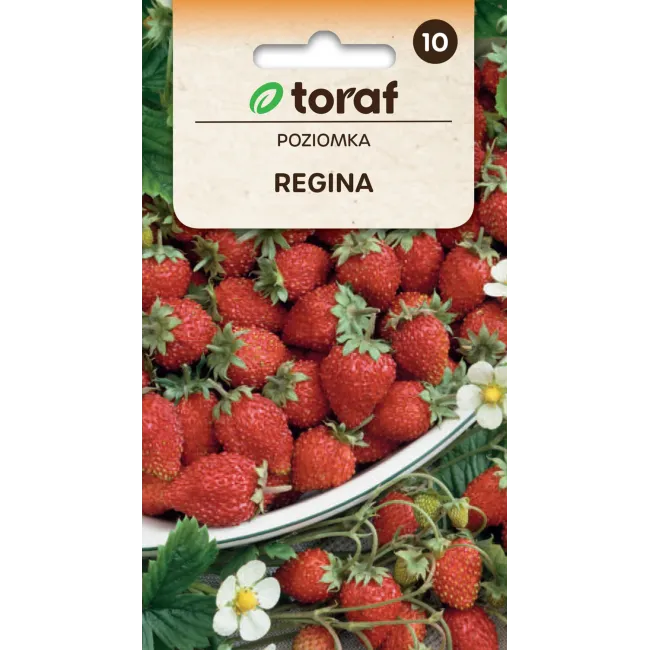 Poziomka Regina (Fragaria vesca var. hortensis) to wielkoowocowa, silnie rosnąca i wyjątkowo łatwa w uprawie odmiana o intensywnie czerwonych, bardzo słodkich i aromatycznych owocach. Rośliny owocują nieprzerwanie od lata aż do jesieni, zapewniając długi okres zbiorów. Owoce są nawet dwukrotnie większe niż u tradycyjnych odmian poziomki. Idealna do uprawy w ogrodzie, na działce oraz w donicach na balkonie i tarasie. Doskonała do bezpośredniego spożycia, deserów i wypieków. Nasiona renomowanego producenta Toraf.