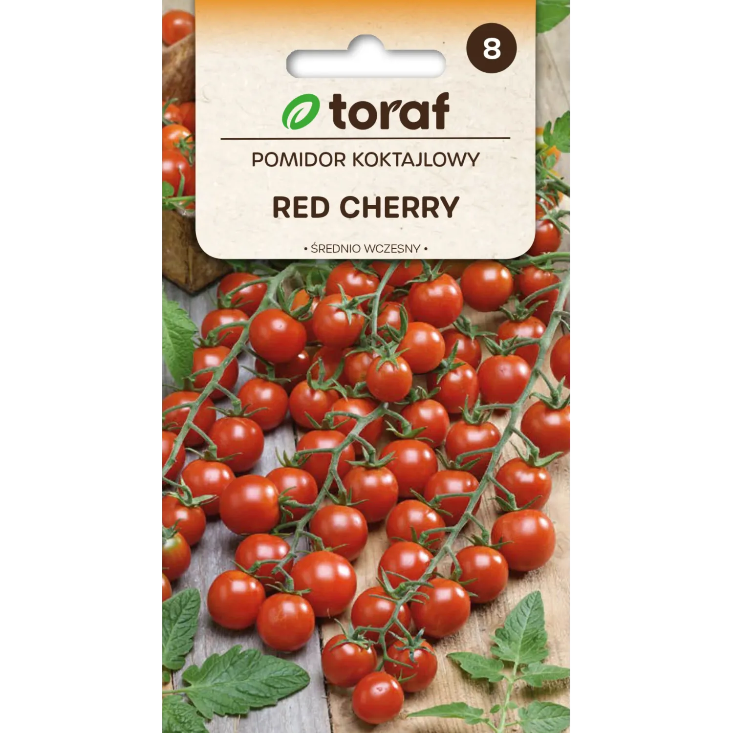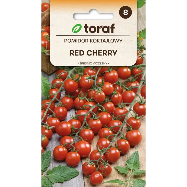 Pomidor koktajlowy Red Cherry to bardzo plenna, średnio wczesna i wysoka odmiana, idealna do uprawy w gruncie oraz pod osłonami. Rośliny tworzą liczne grona drobnych owoców o średnicy 2–3 cm, intensywnie czerwonych, soczystych i wyjątkowo smacznych. Owoce wyróżniają się słodkim smakiem z delikatną nutą kwaskową, dzięki czemu doskonale nadają się do bezpośredniego spożycia, świeżych sałatek, przystawek oraz jako zdrowa przekąska. Odmiana ceniona za niezawodne plonowanie i wysoką jakość owoców. Nasiona renomowanego producenta Toraf.