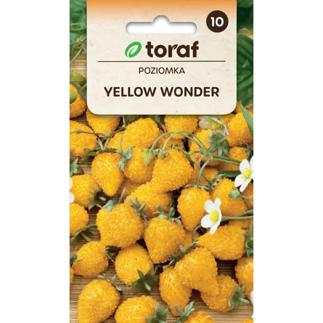 Poziomka Yellow Wonder firmy Toraf to oryginalna, bardzo plenna odmiana o intensywnie żółtych, aromatycznych i lekko wydłużonych owocach. Zachwyca wyjątkowo słodkim smakiem oraz dekoracyjnym wyglądem, a dodatkową zaletą jest brak zainteresowania owocami ze strony ptaków. Odmiana szczególnie polecana do przydomowych ogródków, na działki oraz do uprawy w donicach na balkonach i tarasach. Roślina wykazuje dużą odporność na choroby i mróz, jest łatwa w uprawie i owocuje już w roku siewu, a następnie regularnie od czerwca do końca września.