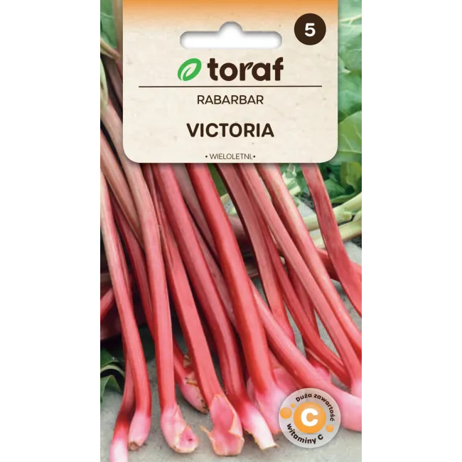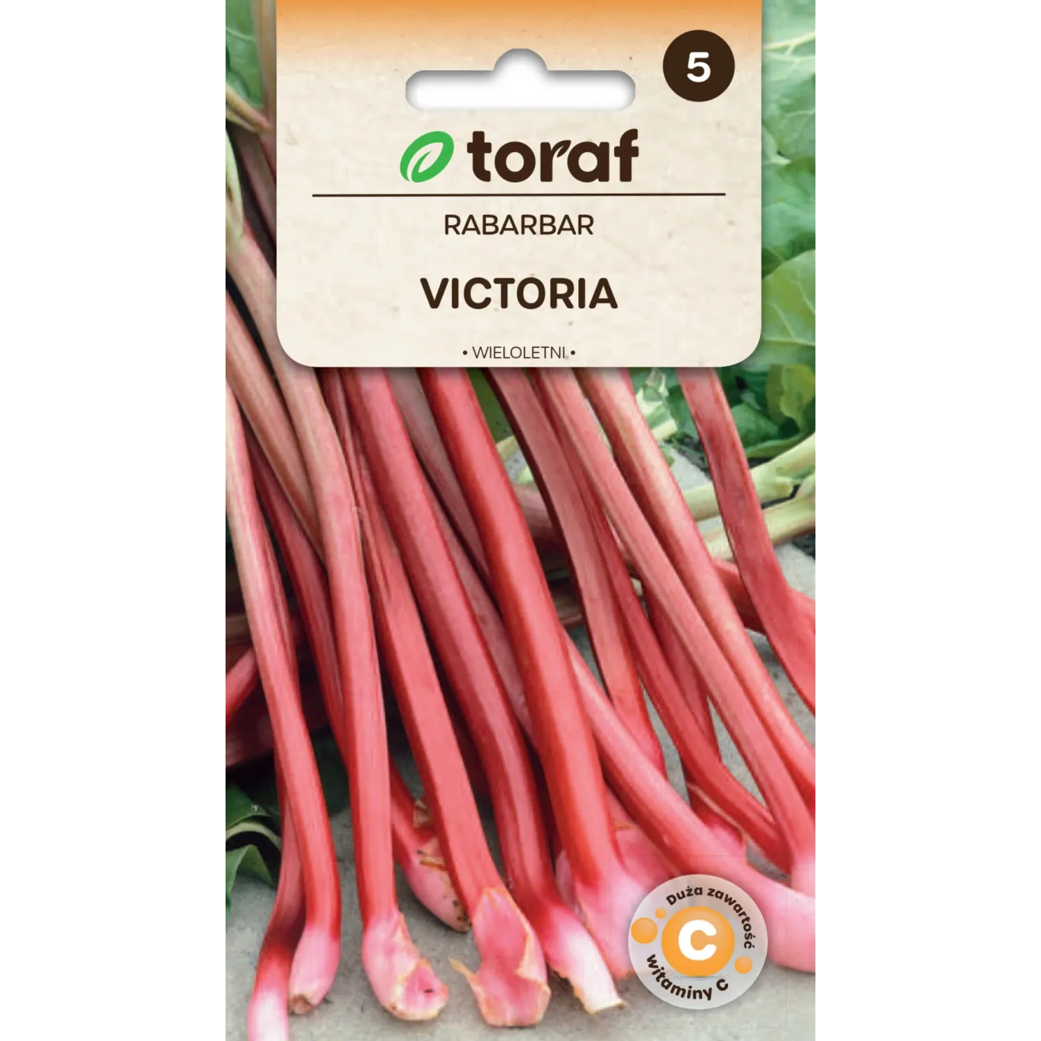 Rabarbar Victoria to sprawdzona, plenna odmiana rabarbaru polecana do uprawy polowej oraz do pędzenia. Roślina wieloletnia, średnio wczesna, odporna na wybijanie w pędy kwiatostanowe. Wytwarza średnio długie, mięsiste ogonki liściowe o atrakcyjnym czerwono-zielonym kolorze i delikatnym, jasnoróżowym miąższu. Ogonki są bogate w witaminy C i A oraz składniki mineralne. Doskonale sprawdzają się do deserów, ciast, kompotów i przetworów. Nasiona renomowanej firmy Toraf gwarantują wysoką jakość i dobrą zdolność kiełkowania.