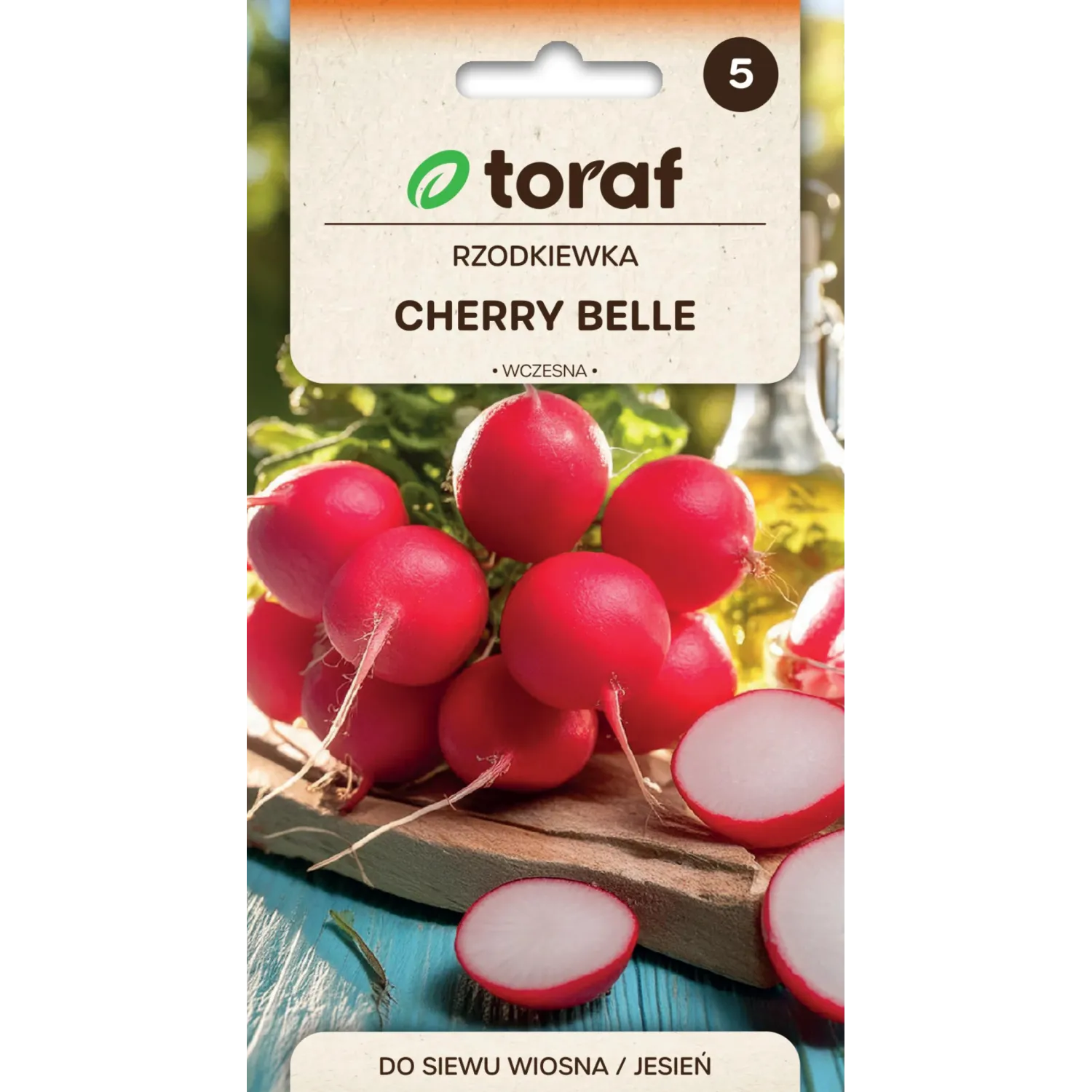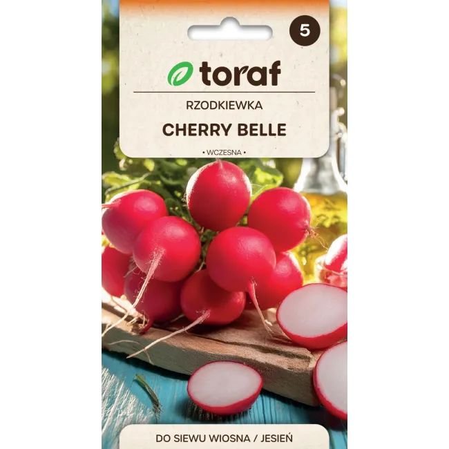 Rzodkiewka Cherry Belle to bardzo wczesna odmiana o krótkim okresie wegetacji, wynoszącym zaledwie 25–30 dni. Przeznaczona do uprawy zarówno w gruncie, jak i pod osłonami. Tworzy regularne, kuliste zgrubienia o intensywnie krwistoczerwonej skórce. Miąższ jest jasny, łagodny w smaku, wyjątkowo soczysty i charakteryzuje się bardzo małą skłonnością do parcenia. Doskonała do uprawy wiosennej i jesiennej. Nasiona firmy Toraf gwarantują wysoką jakość i równomierne wschody.