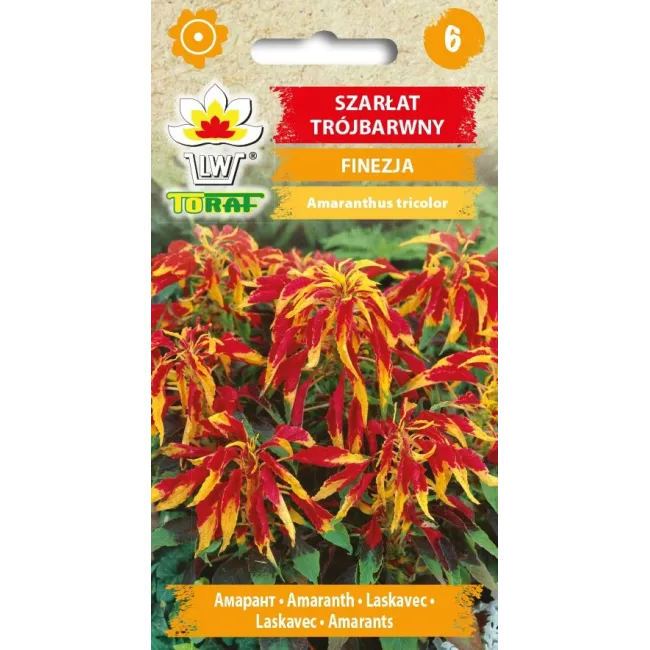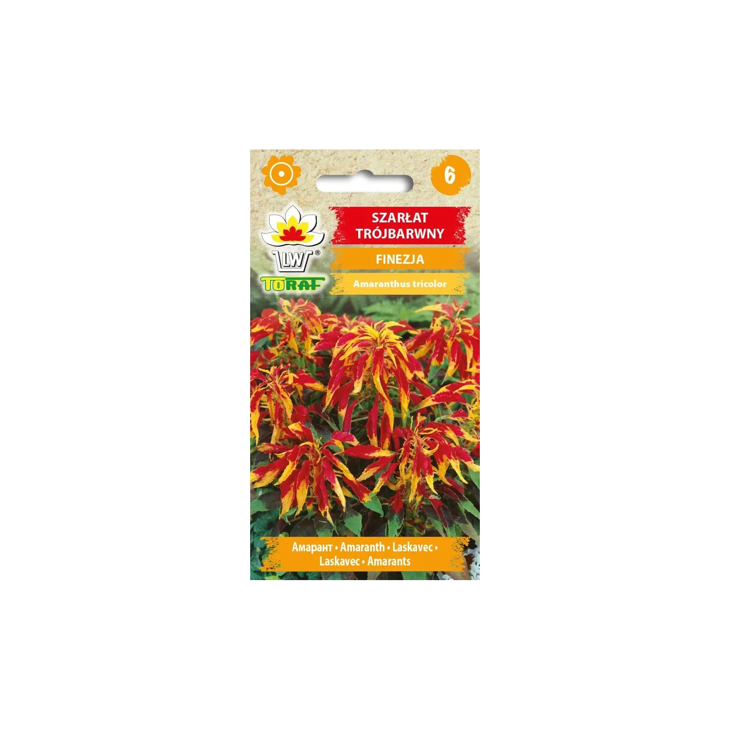 Szarłat trójbarwny FINEZJA (Amaranthus tricolor) to niezwykle dekoracyjna roślina jednoroczna o krzaczastym pokroju i spektakularnych, wielobarwnych liściach. Osiąga wysokość od 100 do 140 cm i zachwyca intensywną paletą barw: czerwieni, różu, żółci, seledynu oraz czekoladowo-brązowych odcieni. Doskonale sprawdza się na wysokich rabatach, w nasadzeniach grupowych, a także jako efektowny kwiat cięty i do suchych bukietów. Najlepiej rośnie na stanowiskach słonecznych. Nasiona można wysiewać pod osłony wczesną wiosną lub bezpośrednio do gruntu. Producent: TORAF.