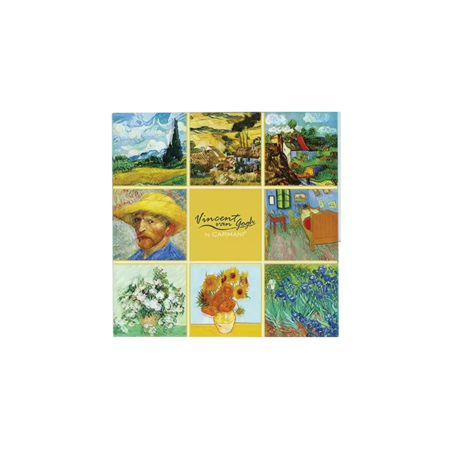 Na podkładce znalazły się motywy z kilku ikonicznych dzieł van Gogha – Autoportret, Słoneczniki, Irysy i Gwiaździsta noc – zestawione w formie artystycznego kolażu. Całość zachwyca kolorystyką i ekspresją charakterystyczną dla stylu artysty.