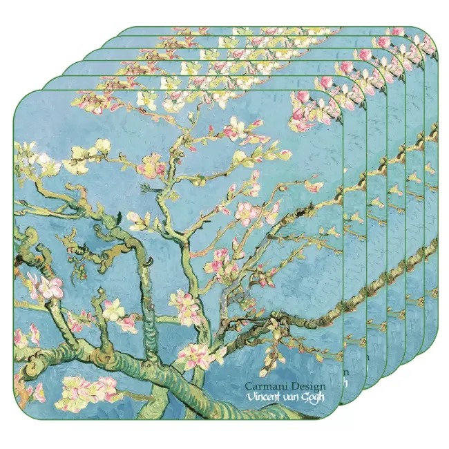 Odkryj wyjątkowe połączenie praktyczności i artystycznego stylu dzięki kompletowi 6 podkładek korkowych CARMANI, inspirowanych dziełem „Kwitnący migdałowiec” (1890) Vincenta van Gogha.