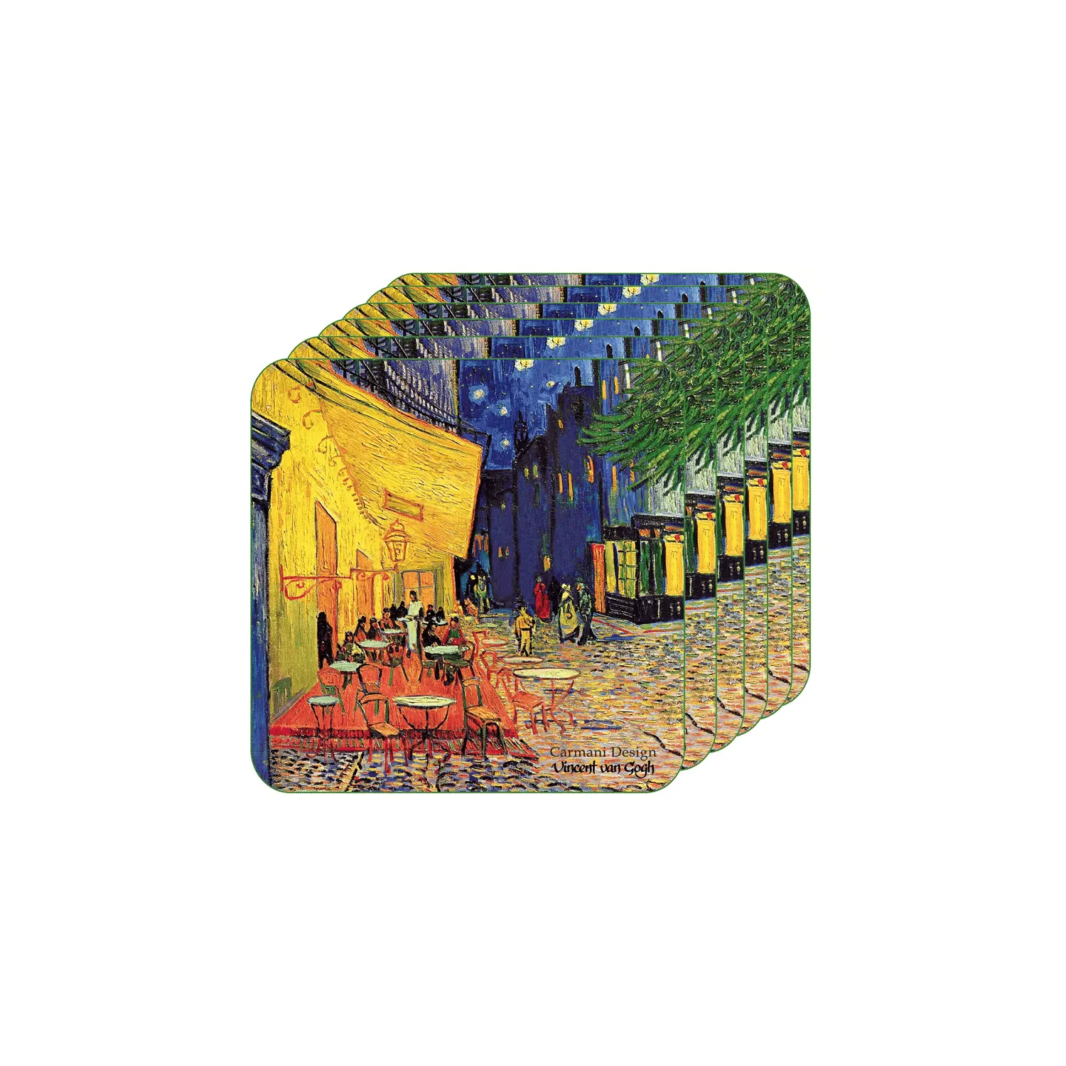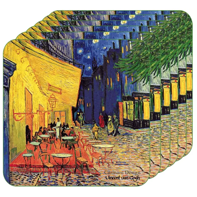 Wprowadź do swojego wnętrza artystyczny klimat z zestawem 6 podkładek korkowych CARMANI, inspirowanych jednym z najbardziej znanych dzieł Vincenta van Gogha – „Café Terrace at Night” (1888).