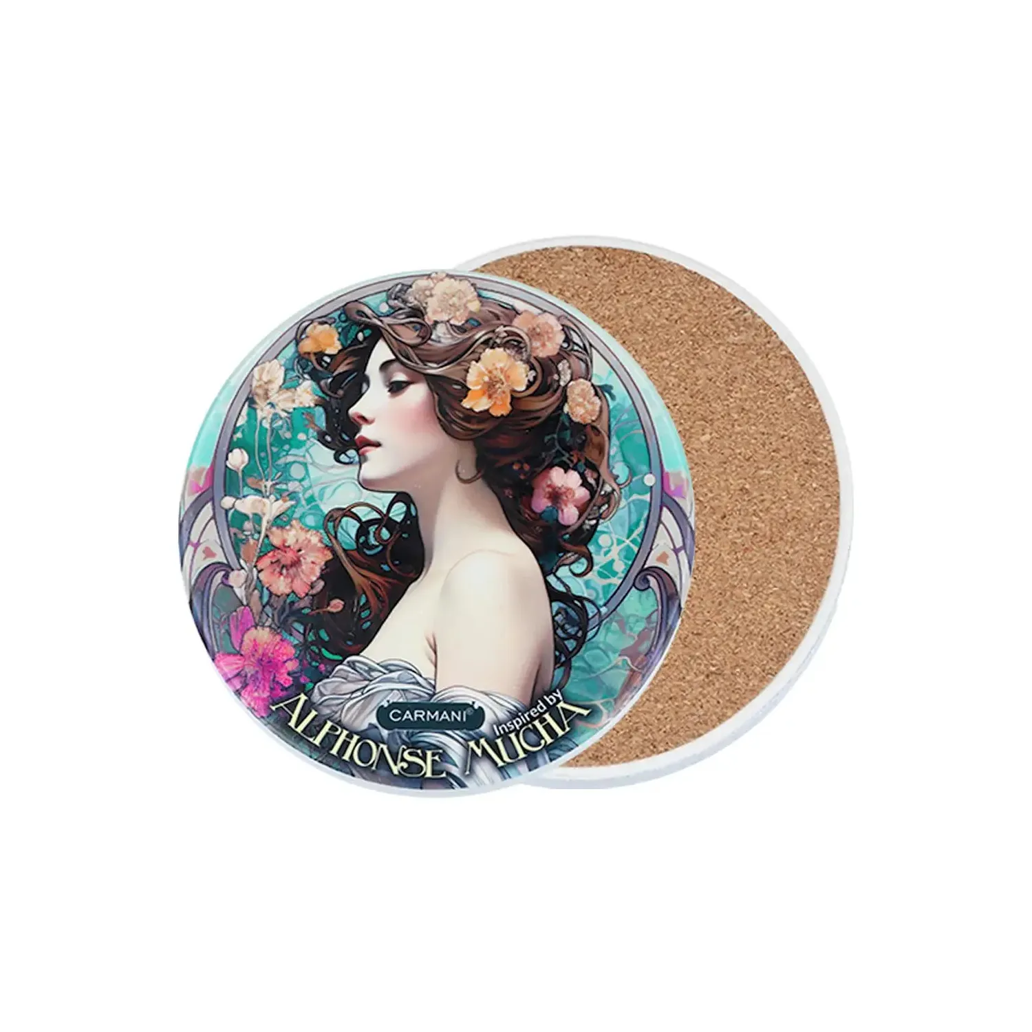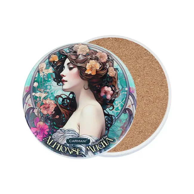 Podkładka ceramiczna inspirowana twórczością Alfonsa Muchy to połączenie elegancji i stylu Art Nouveau. Kwiatowy portret kobiety, pełen subtelnych barw i dekoracyjnych linii, nadaje jej wyjątkowy, artystyczny charakter. Podkładka ma korek antypoślizgowy, który chroni powierzchnie przed ciepłem i zarysowaniami. Idealna pod kubki, szklanki czy filiżanki – doskonała zarówno do codziennego użytku, jak i jako drobny prezent dla miłośników sztuki i pięknych dodatków.