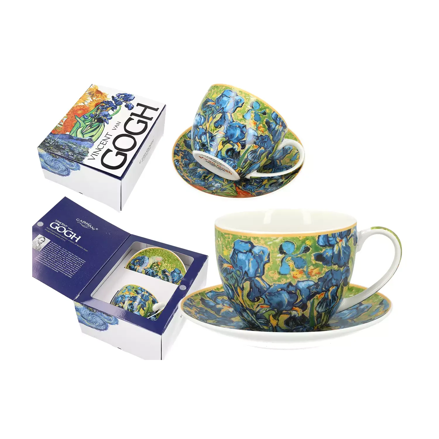 Elegancka porcelanowa filiżanka ze spodkiem z motywem „Irysów” Vincenta van Gogha marki CARMANI to wyjątkowe połączenie sztuki i funkcjonalności.