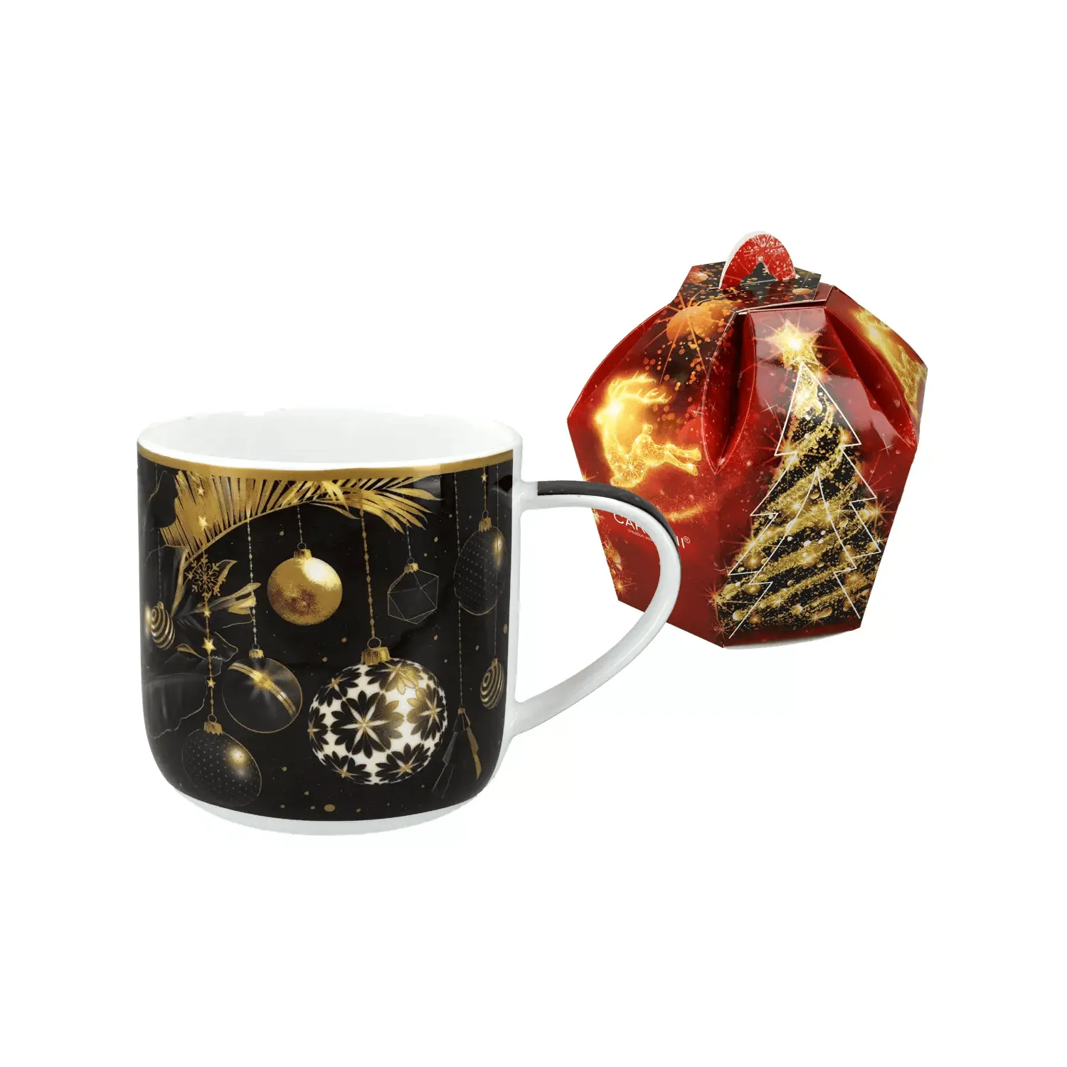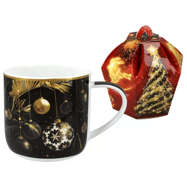 Ten niezwykły kubek świąteczny marki CARMANI to połączenie elegancji, świątecznego nastroju i funkcjonalności. Motyw złotych bombek na czarnym tle zachwyca subtelnym połyskiem i detalami, które doskonale oddają klimat Bożego Narodzenia.