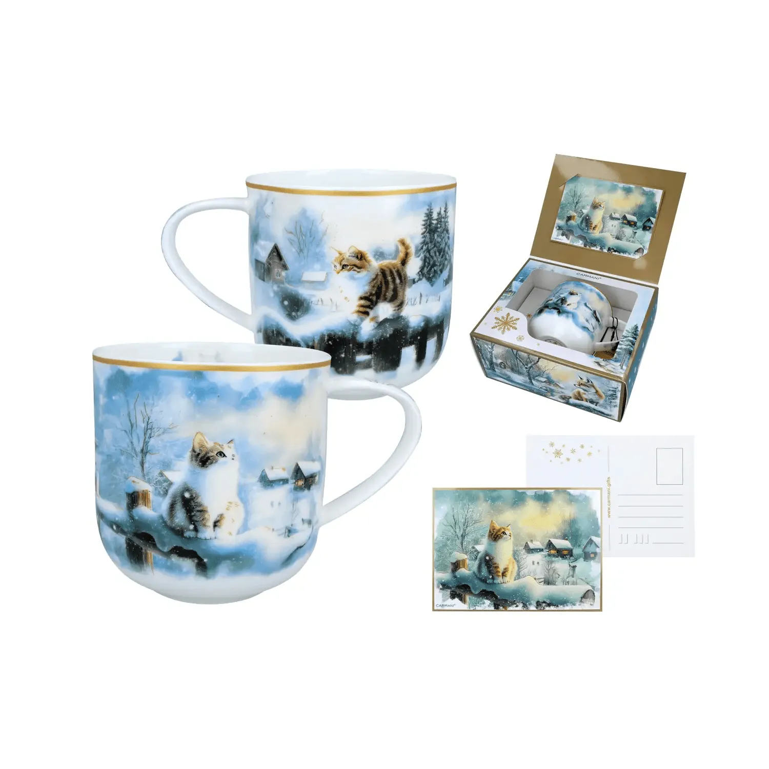 Kubek porcelanowy CARMANI – Zima wszędzie, Kot to połączenie uroku zimowego krajobrazu z ciepłem domowej atmosfery. Ozdobiony malowniczym motywem kota w ośnieżonej scenerii, zachwyca dbałością o szczegóły i subtelnymi, złotymi akcentami. Wykonany z wysokiej jakości porcelany, jest idealny do gorących napojów – herbaty, kawy czy kakao. Zapakowany w eleganckie pudełko z dopasowaną kartką pocztową – doskonały pomysł na prezent świąteczny lub zimowy upominek.