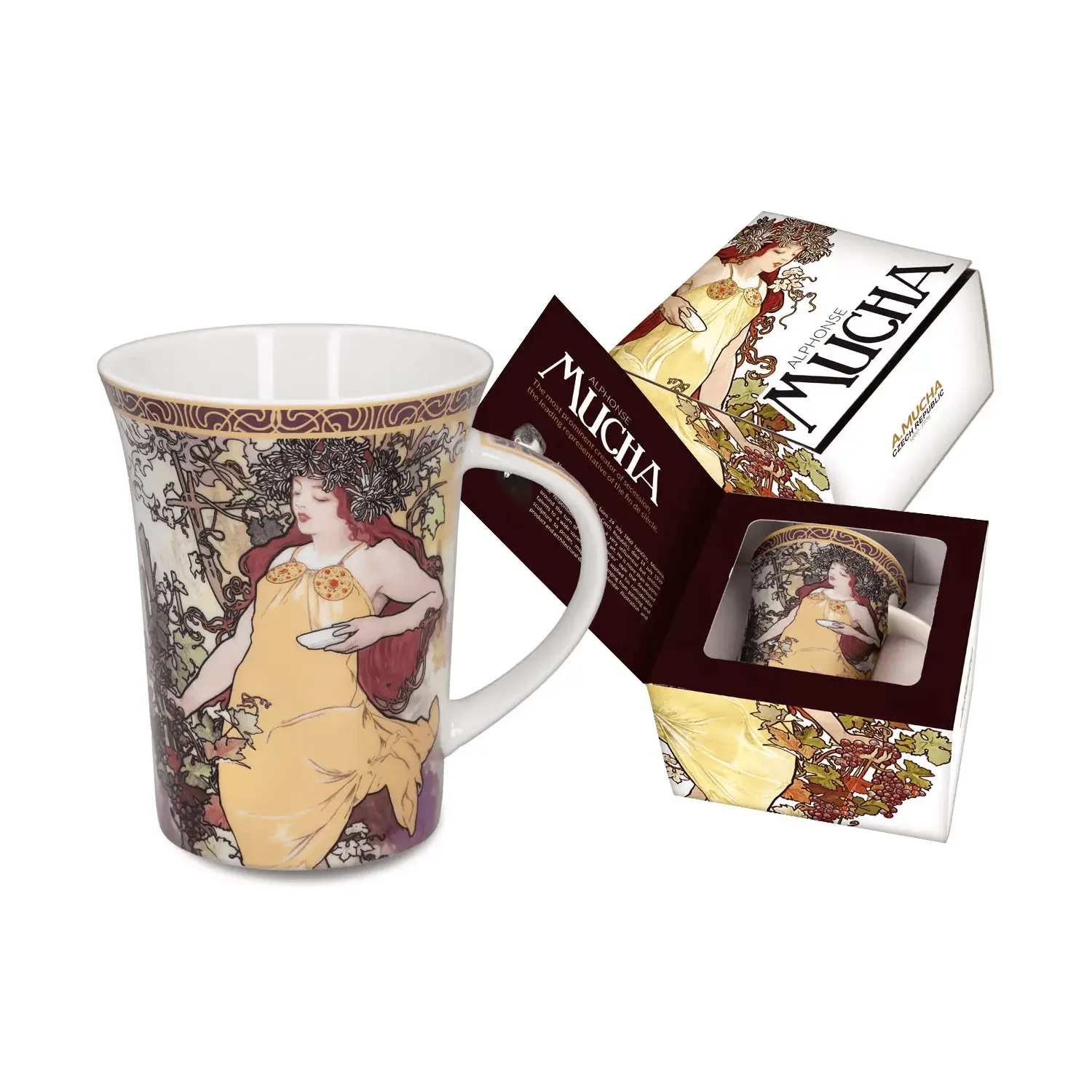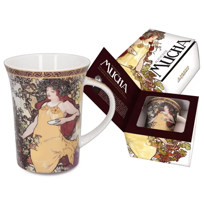 Elegancki kubek porcelanowy z motywem „Jesień” z cyklu Cztery Pory Roku autorstwa Alfonsa Muchy. Wyjątkowe połączenie sztuki i codziennego użytku – idealny dla miłośników stylu secesyjnego. Zdobienia inspirowane malarstwem mistrza nadają mu artystycznego charakteru, a solidne wykonanie gwarantuje trwałość i wygodę picia. Zapakowany w eleganckie pudełko prezentowe – doskonały pomysł na gustowny upominek.