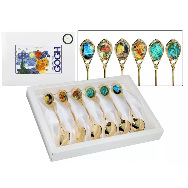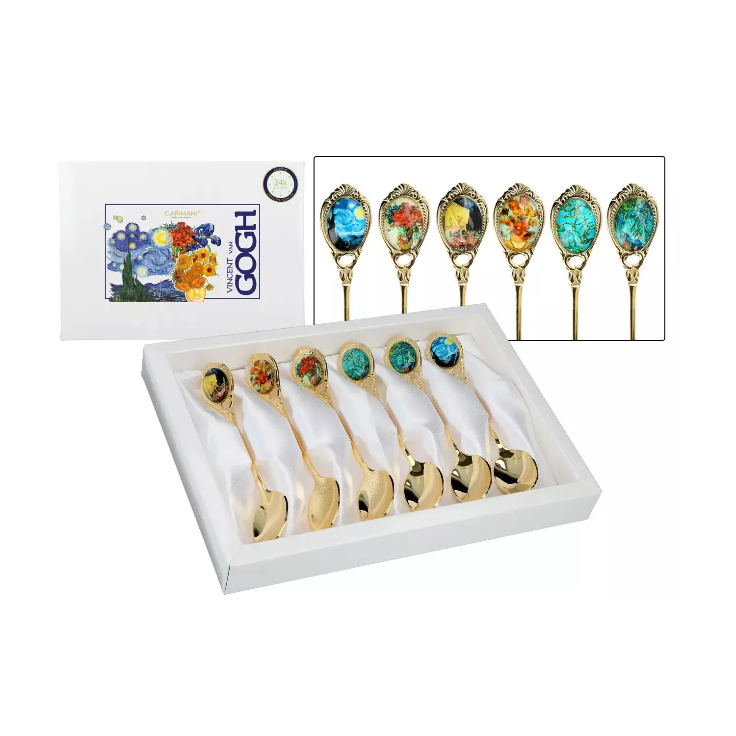 Zestaw marki CARMANI składa się z 6 ozdobnych łyżeczek w kolorze złotym, zdobionych różnymi motywami inspirowanymi obrazami Vincenta van Gogha. Każda łyżeczka posiada unikalny detal, tworząc spójny, artystyczny komplet.