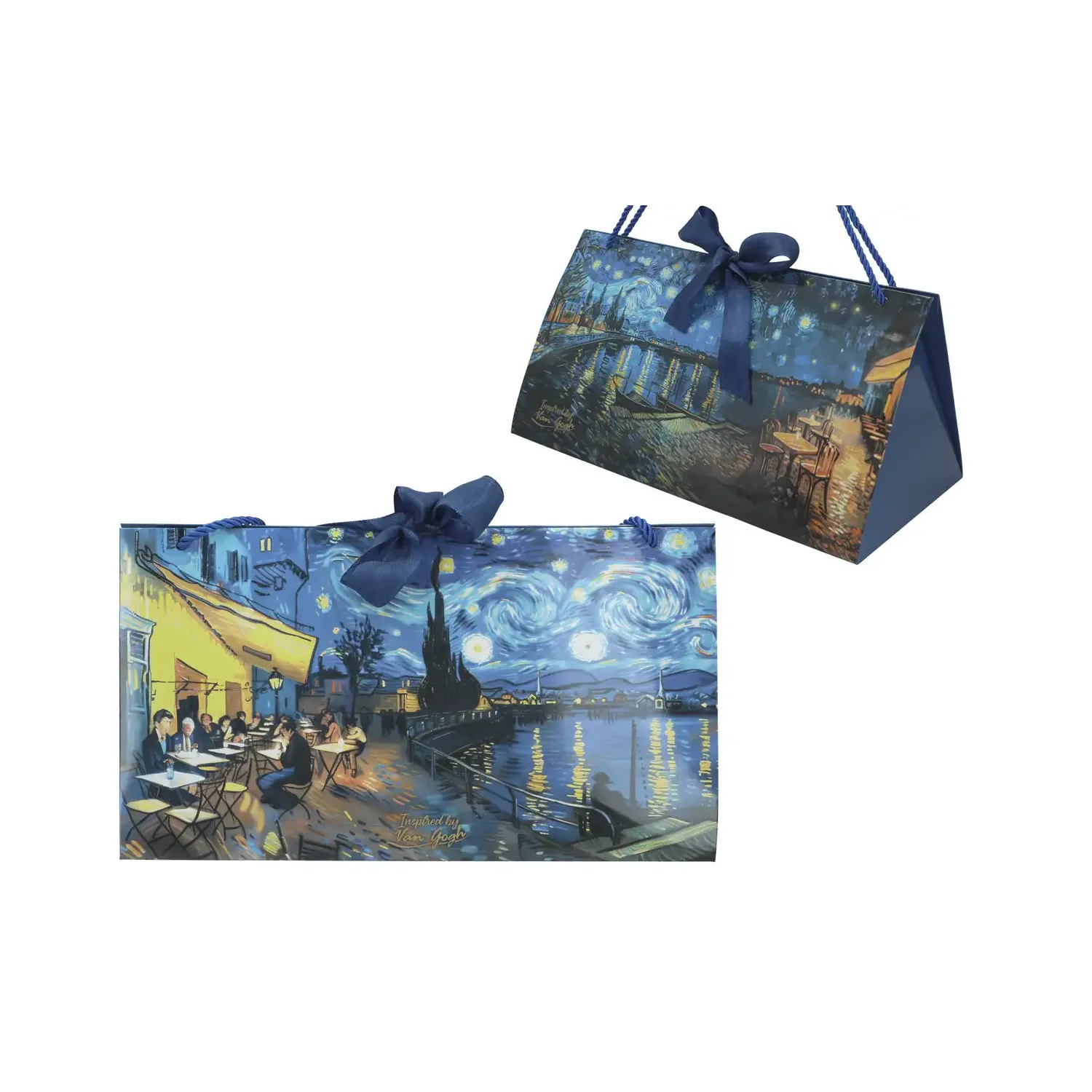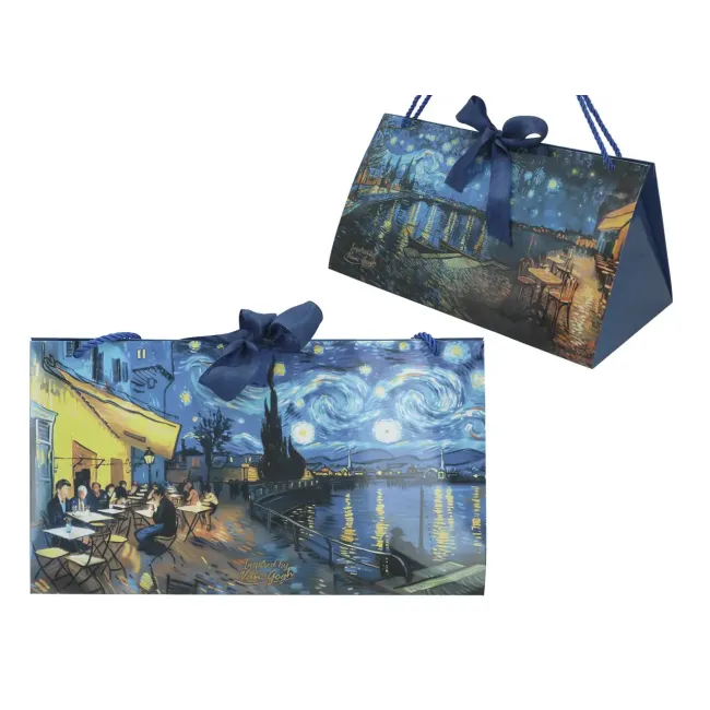 Elegancka torebka prezentowa duża (17x31 cm) inspirowana nocnymi pejzażami Vincenta van Gogha to wyjątkowa oprawa prezentu. Klimatyczna scena z rozświetlonym miastem i odbiciami świateł w wodzie nadaje całości romantyczny i artystyczny charakter. Oryginalny, trójkątny kształt oraz ozdobna kokarda sprawiają, że torebka wyróżnia się na tle klasycznych opakowań. Idealna do większych prezentów i eleganckich zestawów.