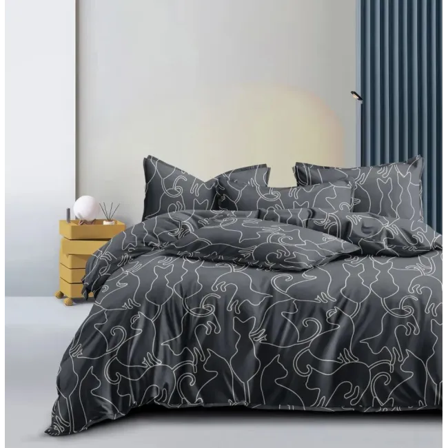 Czarna pościel zdobiona minimalistycznymi konturami kotów tworzy wyjątkowy, artystyczny efekt, który przyciąga wzrok i pasuje do każdego wnętrza – zarówno klasycznego, jak i nowoczesnego.