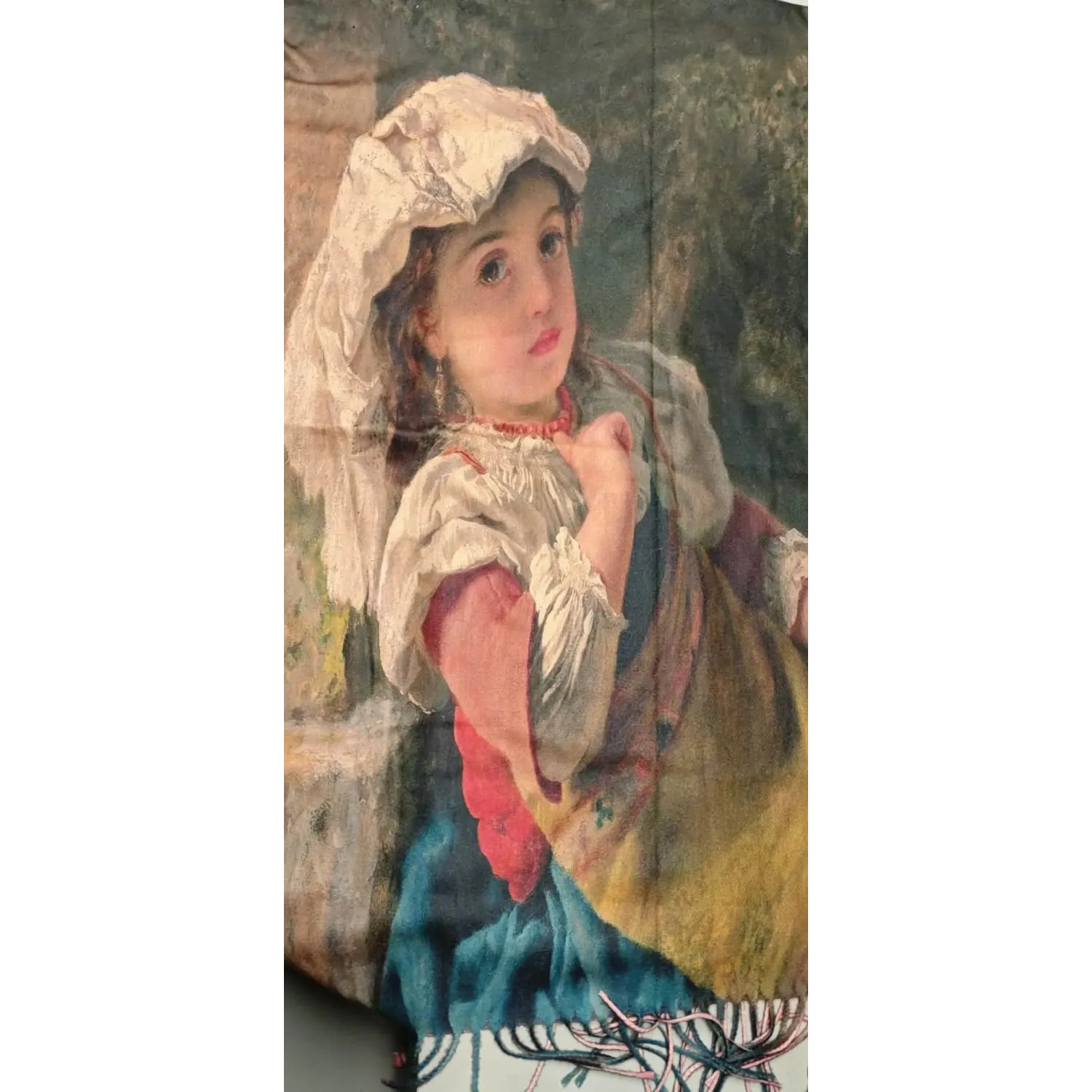 Szal Portrait Classic 180×70 cm to propozycja dla osób, które lubią dodatki o niepowtarzalnym charakterze i subtelnym artyzmie. Nadruk przedstawia dziewczynkę w tradycyjnym stroju, uchwyconą w sposób przypominający portrety malowane w XIX wieku. Delikatne światło, klasyczna kompozycja i miękka paleta barw nadają temu wzorowi wyjątkowe, malarskie wykończenie.