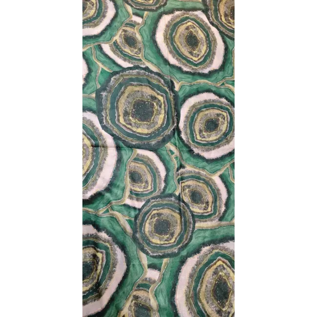 Szal Mineral Green 200×70 cm to propozycja dla osób, które cenią wzory inspirowane naturą i organiczną estetyką. Motyw przypominający przekroje minerałów i kamieni szlachetnych tworzy kompozycję pełną głębi i harmonii. Odcienie zieleni, beżu i subtelnych złamanych tonów układają się w koncentryczne formy, które przyciągają wzrok i nadają całości spokojny, elegancki charakter.