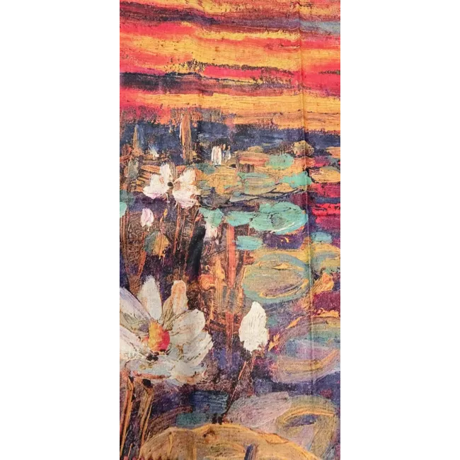 Ten szal to ukłon w stronę impresjonizmu i jednego z najbardziej rozpoznawalnych motywów w historii malarstwa – lilii wodnych. Kompozycja barw i miękkich pociągnięć przypomina atmosferę ogrodów w Giverny oraz malarskie studia światła i koloru, z których słynął Claude Monet. Intensywne czerwienie, złoto, fiolety i turkusy przenikają się niczym odbicia na tafli wody, tworząc wzór pełen ruchu i głębi.
