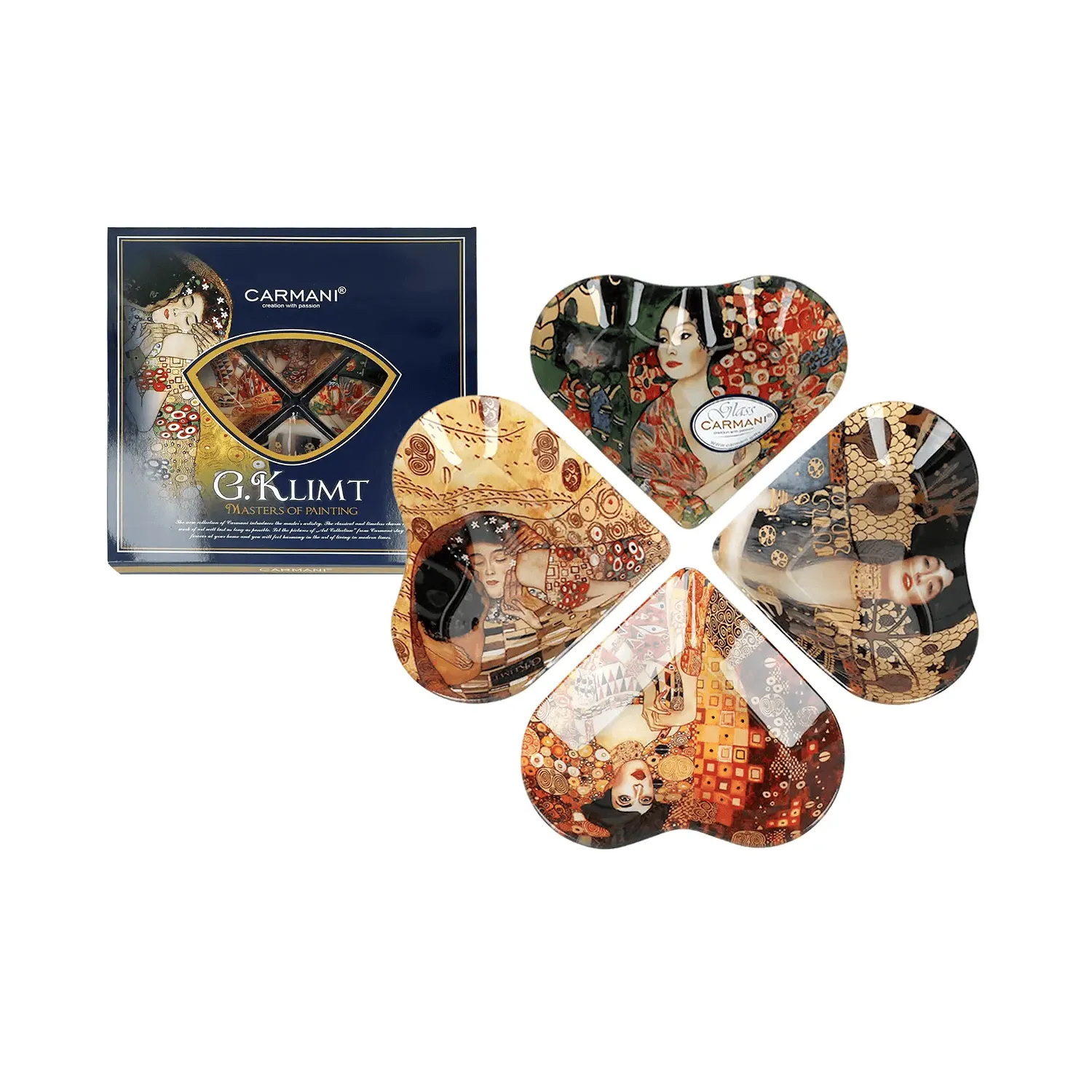 Zestaw czterech szklanych miseczek dekoracyjnych inspirowanych sztuką Gustava Klimta to elegancka ozdoba i wyjątkowy pomysł na prezent. Każda miseczka przedstawia inny fragment dzieł mistrza secesji, a razem tworzą kształt czterolistnej koniczyny – symbolu szczęścia i harmonii. Zestaw pięknie prezentuje się na stole, komodzie lub toaletce, dodając wnętrzu artystycznego charakteru. Zapakowany w eleganckie pudełko z kolekcji CARMANI Masters of Painting.