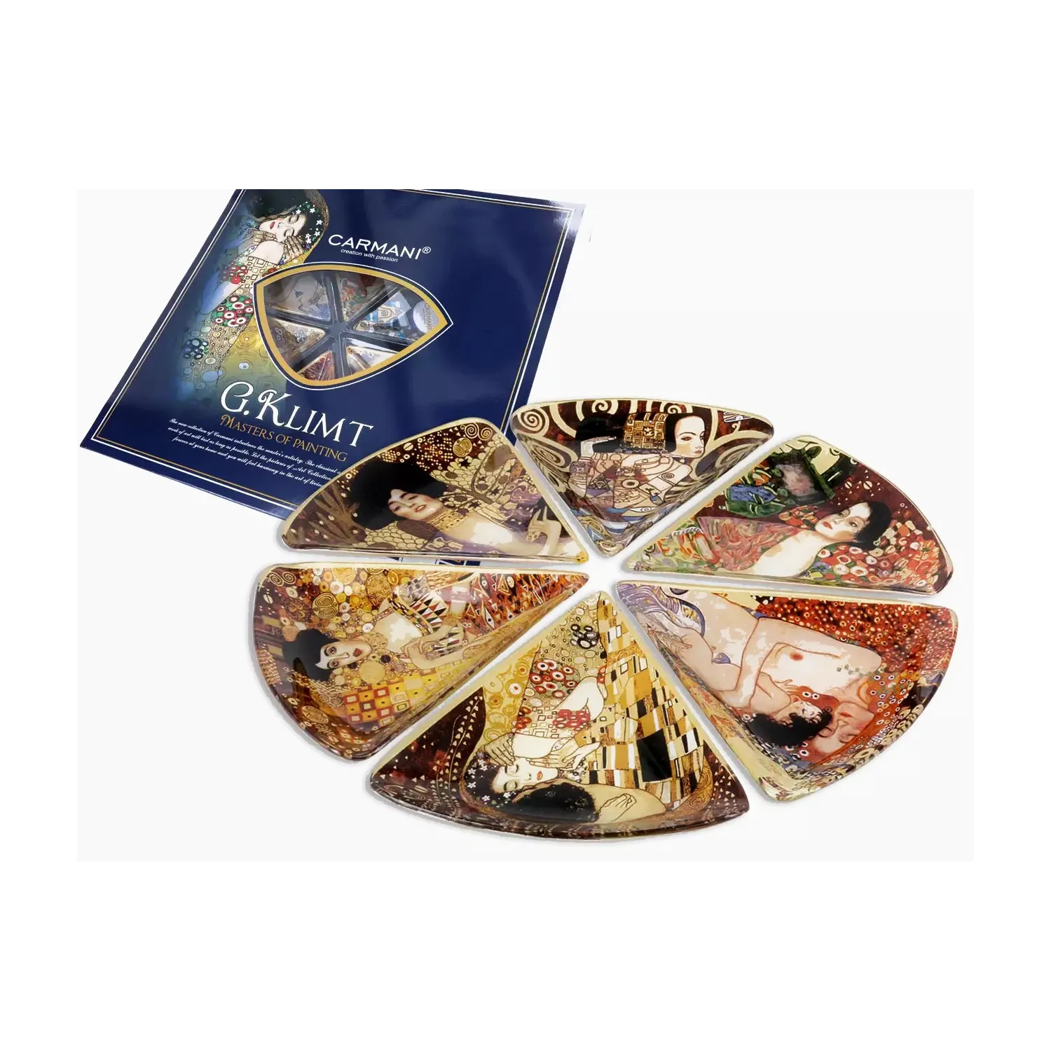 Zestaw 6 elementów tworzy spójną kompozycję inspirowaną twórczością Gustava Klimta, gdzie każdy fragment opowiada własną historię.