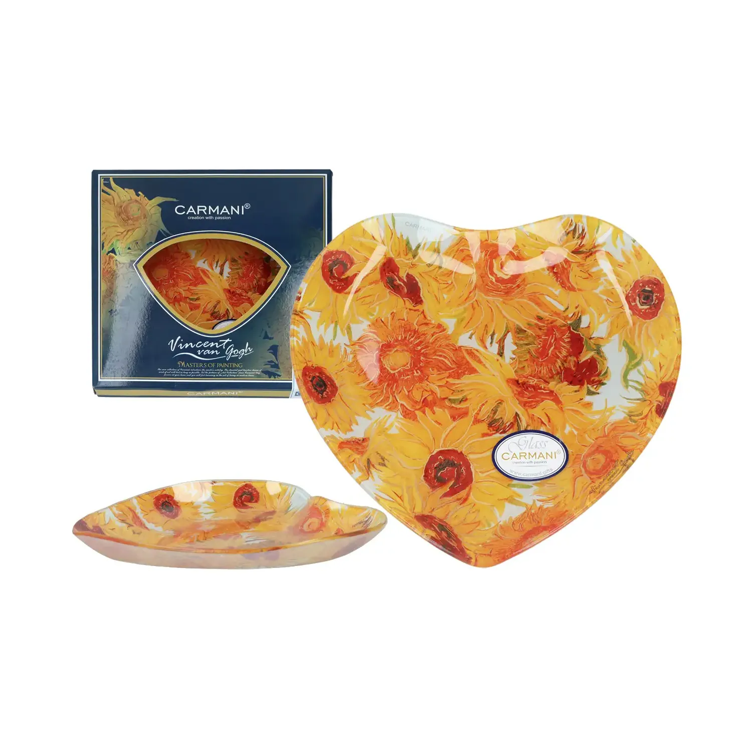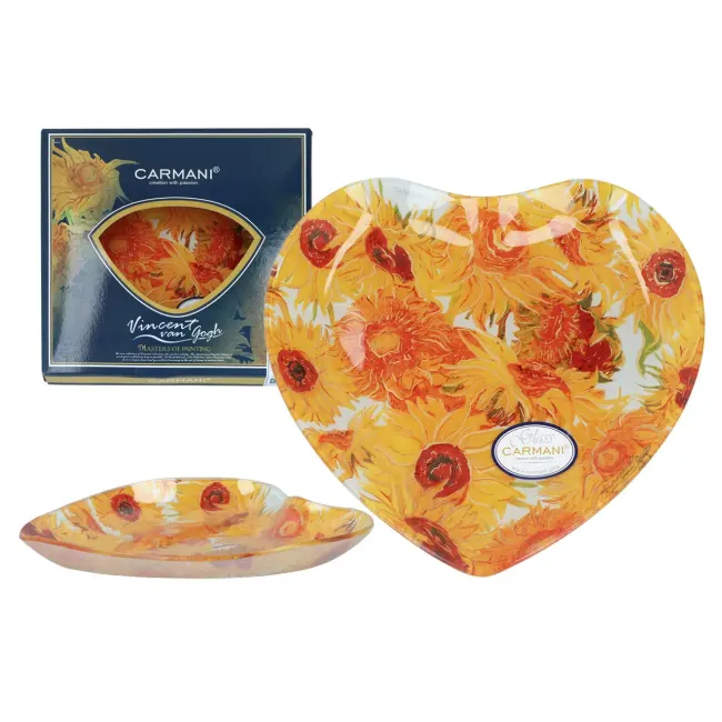 Talerz dekoracyjny w kształcie serca z reprodukcją „Słoneczników” Vincenta van Gogha to propozycja dla osób, które chcą wprowadzić do wnętrza kolor, energię i artystyczny charakter.