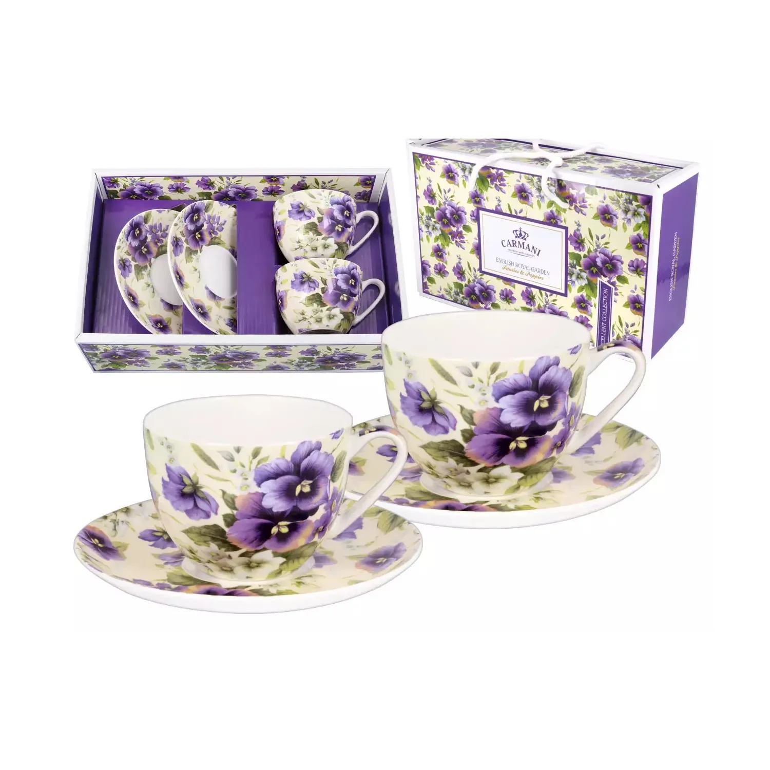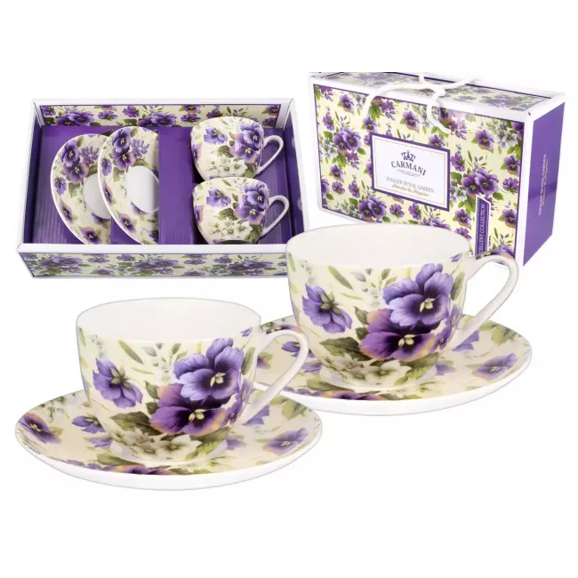 Zestaw dwóch filiżanek ze spodkami Carmani z motywem bratków to połączenie klasycznej elegancji i delikatnego, kwiatowego wzornictwa.